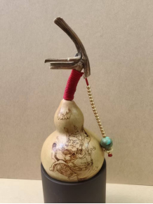 该获奖作品为一枚葫芦烙画挂件,将传统钟馗形象、福禄寓意与非遗烙画技艺凝于方寸之间。葫芦象征福禄,钟馗代表正气驱邪,二者结合,寄托着对美好生活的祝愿。作品兼顾传统韵味与现代实用,可挂于背包、车内或家居中,让非遗融入日常生活。